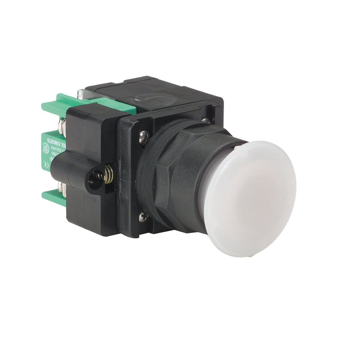 FVPPM24LW-IMCWE-NO-NO | FVPPM24LW-IMCWE-NO-NO - 30mm Main. Illum. 2-Pos. Push-Pull Pushbutton, Full Voltage, 24V AC/DC, LED White, Black Polyester Clamp Ring, Mushroom, White Lens, 2NO | C3 Controls