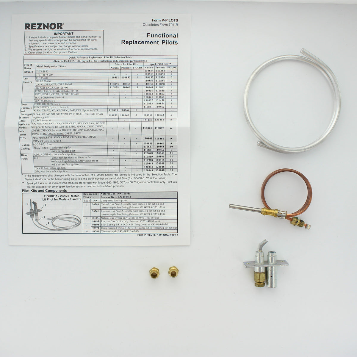 The REZNOR MPK-110856-REZNOR Pilot Assembly Kit is an essential component for maintaining the performance of your gas-powered equipment. This kit includes all the necessary parts to replace or repair the pilot assembly, ensuring the safe and efficient ignition of your equipment.