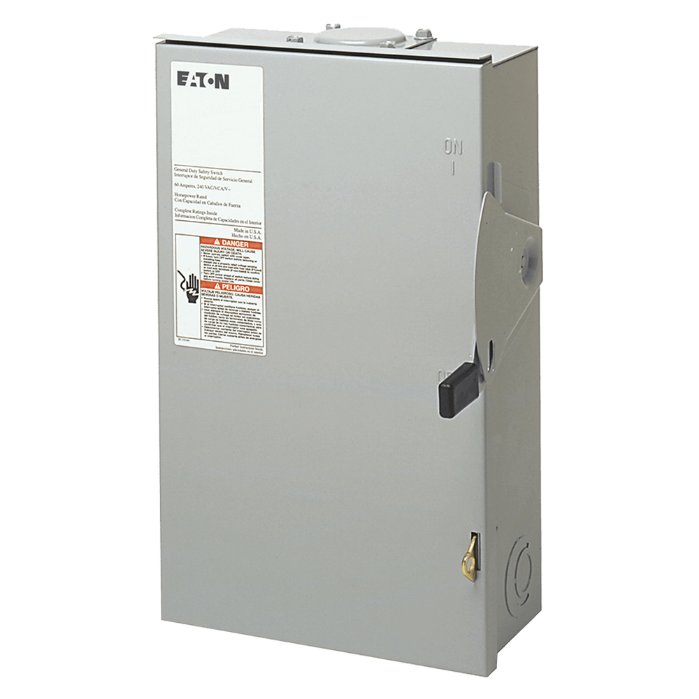 Our HVAC supply store offers the best prices and fast shipping on the DG322URB disconnect switch. Contact us today to learn more and upgrade your electrical safety measures. The Eaton DG322URB 3 Phase Disconnect, 60 fusible Amps, 1/4 in., 1/2 in., 3/4 in., 1 sizes, 240VAC, these disconnects are 3-pole, 3 or 4-wire, 240VAC rated general duty safety switches. They are UL listed and meet UL 98 for enclosed switches and NEMA Std. KS-1. They are suitable as service entrance equipment when applied with neutral or ground lug kit. They come with rainproof NEMA 3R enclosure.